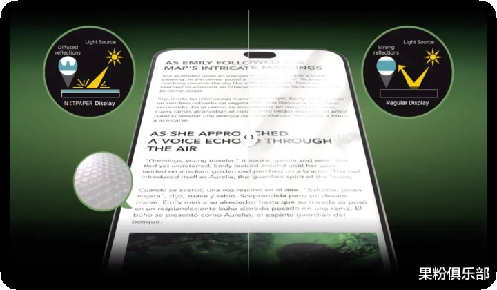 其原理是在屏幕表面覆盖一层独特的纳米漫射层,能够高效利用环境光,大幅降低屏幕对背光的依赖。