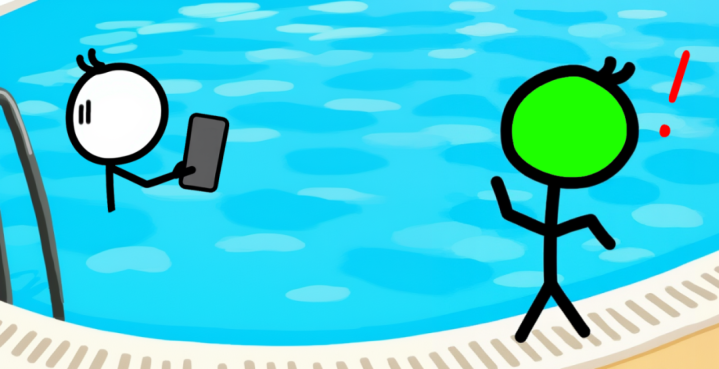 泳池里的男人非常扫兴,跟队友吐槽再也不买这个牌子的手机了。