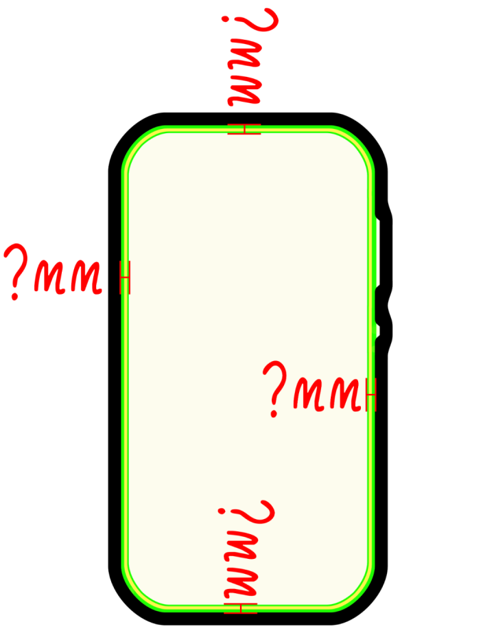 由于屏幕排线会从下方引出,所以这里需要额外增加胶水的厚度,以保护屏幕模组。这样一来,下边框的极限只能到达1.45mm左右。(为了整体四边等宽,其他三边被迫做宽了一丢丢。)