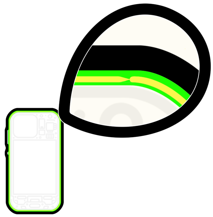 之前我们所讲的点胶技术,都是把屏幕的玻璃盖板与中框相连。但正如前述,为了保证结构强度和柔韧度,胶线本身不能窄于0.45mm,再加上结构余量,边框几乎不能低于2mm。(这也是FindX7边框的宽度)